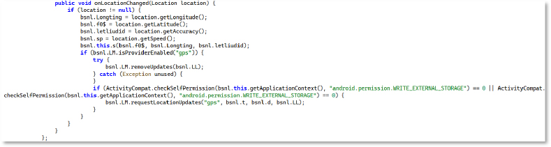 The method continuously retrieves updated GPS parameters—longitude, latitude, accuracy, and speed—and writes them to local storage. By persisting in these values, the malware maintains a detailed log of location telemetry, enabling precise tracking of the device’s movement patterns over time.