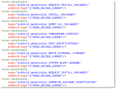 The manifest declares several high-risk Android permissions. Each one expands the malware’s ability to deploy and manage additional payloads: