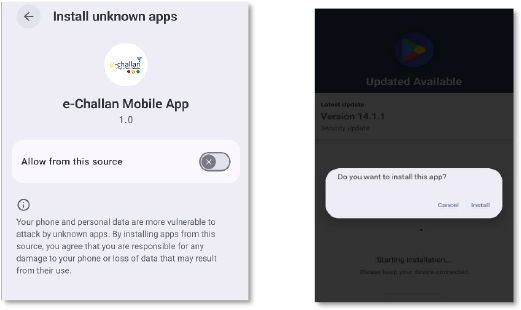 Delivery is achieved through malicious download links, fake mParivahan and e-Challan landing pages, and deceptive payment verification lures that socially engineer users into installing the APK and interacting with fraudulent payment flows. Exploitation occurs when victims enable installation from unknown sources, grant high-risk permissions, and respond to deceptive Google Play–style security update prompts. Installation and persistence are reinforced through OEM-specific auto-start abuse, background execution permissions, disguised system components, and power management bypass techniques across major Android device manufacturers.
