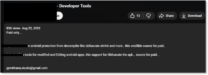 Further investigation reveals a public video promoting two developer tools, both commercial products commonly used for obfuscation, code shrinking, and anti-decompilation. The same email address ([email protected]) appears as a contact point in this ecosystem, suggesting a link between the malware’s embedded communication channel and the commercial obfuscation tooling often leveraged by Android malware developers to hinder reverse engineering.