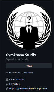 A developer profile using the Gymkhana Studio identity appears with branding consistent with the email address embedded in the malware. The profile shows activity across cyber-related communities and development networks, creating an OSINT linkage between the malware artifacts and a broader Android tooling.
