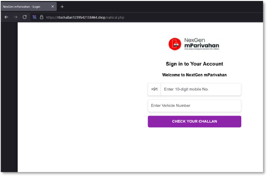 The phishing webpage posing as the mParivahan challan lookup portal requests the victim’s mobile number and vehicle number. The off-brand domain (rtochallan[1-9][A-Z].shop) clearly signals non-government origin. This stage is designed to harvest personal and vehicle identifiers, which are later used for targeted fraud, profiling, or follow-on social-engineering steps.