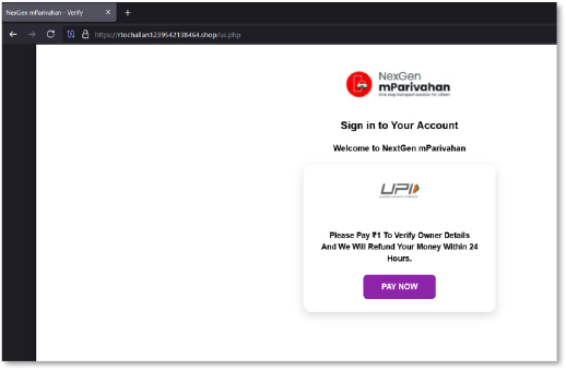 Once basic information is captured, the victim is pushed into a fabricated verification step asking for a ₹1 payment “to confirm vehicle ownership.” The promise of a refund within 24 hours is a standard lure. This screen is crafted to trigger urgency and compliance while moving the victim toward the attacker-controlled payment funnel.