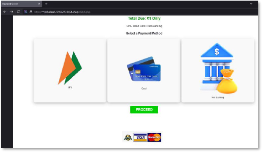 The next screen presents a complete fake payment interface with UPI, card, and net-banking options. While it visually resembles legitimate gateways, it is engineered to collect sensitive financial information, including card numbers, CVV, expiry details, UPI IDs, and banking credentials. This step demonstrates that the operators built a multi-channel credential theft stack rather than a single-method phishing flow.