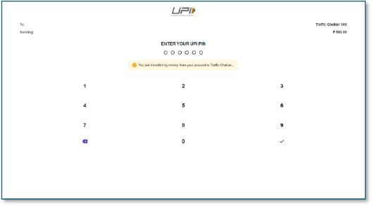 Here, the victim is shown a counterfeit UPI PIN entry keypad with the transaction labelled as “Traffic Challan.” The attackers leverage this interface to capture the victim’s UPI PIN—arguably the most critical authentication factor—enabling unauthorized debits directly from the bank account without requiring further user interaction
