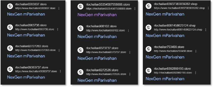 All domains reuse the “NexGen mParivahan” branding and follow nearly identical templates. The sheer volume of automatically generated .store, .shop, and .online domains indicates a widespread phishing infrastructure operated by the threat actors. This reflects a scalable and automated ecosystem designed to constantly rotate domains to evade takedowns and maximize victim reach.