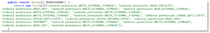 Dex decompilation reveals a method that returns an array of Android permissions, including high-risk ones, such as READ_SMS, WRITE_SMS, READ_CONTACTS, WRITE_EXTERNAL_STORAGE, ACCESS_NETWORK_STATE, CHANGE_WIFI_STATE, INTERNET, ACCESS_WIFI_STATE, and SEND_SMS. This list is used by the malware to request excessive privileges at runtime, enabling broad control over the device.
