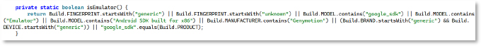 The method isEmulator inspects build properties for emulator markers such as “generic,” “unknown,” “google_sdk,” “Android SDK built for x86,” “Genymotion”, and “google_sdk,” allowing the malware to avoid running in analysis environments intended to detect and avoid execution in virtual environments used by researchers.