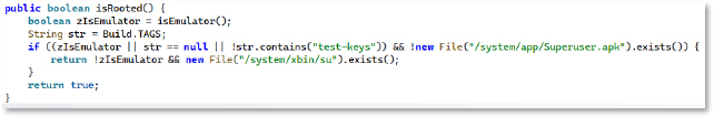 The IsRooted method checks for “test-keys” and files like /system/app/Superuser.apk or /system/xbin/su to confirm rooting and enable deeper access.
