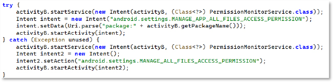 The code tries to start a service and then redirects the user to the MANAGE_APP_ALL_FILES_ACCESS_PERMISSION settings page. If that fails, it falls back to the more general MANAGE_ALL_FILES_ACCESS_PERMISSION page. This flow is meant to push the user into granting full file-access privileges, giving the malware access to the device’s file manager, including photos, videos, audio, and documents, with the ability to delete files or folders remotely.