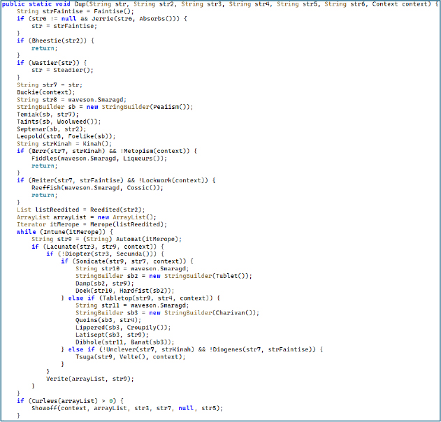 The dropper employs Java reflection to access Android’s internal ActivityThread class, retrieve the private sPackageManager field, and replace it with a dynamic proxy backed by the dropper itself as the invocation handler. This means that every PackageManager call made by any component – including Google Play Protect and enterprise security frameworks – is silently intercepted. The proxy’s invocation handler inspects each intercepted method call and returns fabricated results for signature-related queries, using a hardcoded Base64 certificate string embedded in the dropper.