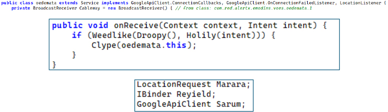 The manifest declares a service with foregroundServiceType=”location” and stopWithTask=”false”, ensuring continuous location monitoring that survives both app closure and task removal. The service implements Google Play services’ FusedLocationProviderApi – the most accurate and battery-efficient location API on Android, combining GPS, Wi-Fi, and cell tower triangulation for the best available fix while consuming minimal battery to avoid user suspicion. The service maintains a persistent GoogleApiClient with auto-reconnection logic. On each location update, coordinates are stored to SharedPreferences for use by the geo-fenced dispatcher. An inner BroadcastReceiver dynamically updates the foreground notification language when the device locale changes, maintaining the disguise as a legitimate alert service.
