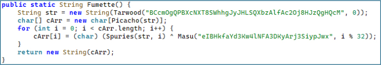 Every sensitive string across all malicious components uses an identical but individually keyed encryption pattern. The ciphertext is stored as a Base64-encoded string, decoded at runtime, then XOR’d against a unique 32-character key using modular indexing. The critical detail is that each obfuscated string uses a different key – there is no single master key. This forces analysts to individually reverse-engineer each decryption method, dramatically increasing the cost of static analysis.