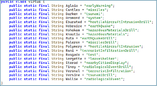Figure 18 – Civil Defense Alert Type Constants – Identical Categories to Legitimate Red Alert App for Sustained Masquerade.