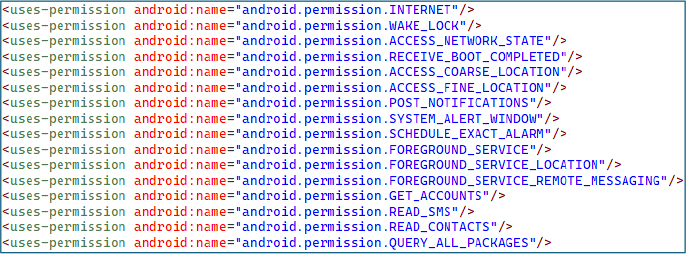 Figure 2 – High-Risk Permission Declarations in AndroidManifest.xml