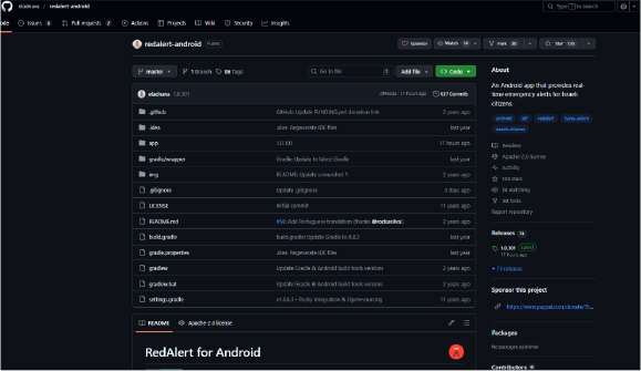 Figure 21 – Publicly Available RedAlert Android Application Source Code Repository on GitHub.
