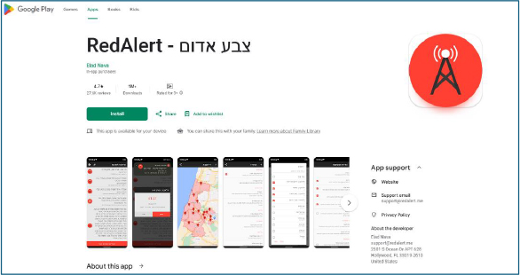 Figure 22 – Legitimate RedAlert (צבע אדום) Application Available on Google Play Store.