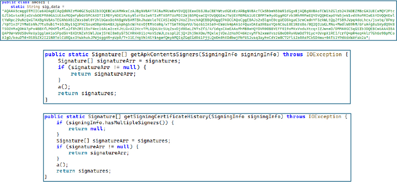 The unusually long 27-year validity period ensures the forged certificate never expires during the operation’s lifetime. Two methods – one for the legacy getApkContentsSigners() API and one for the newer Android P+ getSigningCertificateHistory() API – ensure both legacy and modern signature verification paths return the forged credentials.