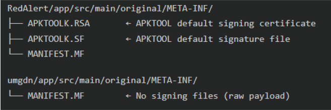 The RedAlert variant’s META-INF directory contains files named APKTOOLK.RSA and APKTOOLK.SF. These are the default signing artifact filenames produced by APKTOOL, the widely-used Android reverse engineering tool, when repackaging a decompiled APK. Their presence conclusively establishes the attack methodology: the threat actor decompiled a legitimate Red Alert APK using APKTOOL, injected the dropper packages, placed the 12MB spyware payload in the assets directory, and re-signed the modified APK with a custom key. The spyware variant’s META-INF directory contains no signing files at all, consistent with it being the raw extracted payload rather than a standalone distributable APK.