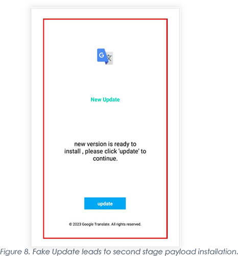 Upon clicking ‘update’ (Figure 8), the apps take victims to the next page where they interact with the main payload for its installation.