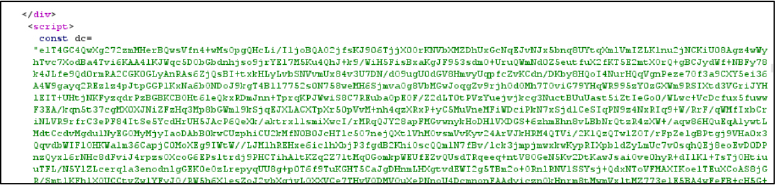 The email auto-fill is performed by heavily obfuscated JavaScript delivered in the server’s response. The code contains an encrypted data payload (const dc=”e1T4GC4QwXg272zm…). When executed in the victim’s browser, this script decrypts the payload using XOR operations and custom algorithms, extracts the victim’s email address that was embedded in the URL path, and automatically populates it into the login form field without any manual input from the user.