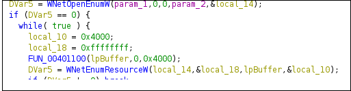 The APIs mentioned in Figure22 given below that is WNetOpenEnumW and WNetEnumResourceW are used to enumerate the network resources.