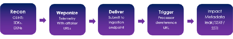 Trigger & Enrichment: The attacker submits the crafted report to the ingestion endpoint. The telemetry processor, following normal enrichment logic, dereferences the supplied URLs. The attacker observes inbound HTTP(S) requests and captures source IPs, headers, and other request metadata. This metadata enables profiling and may reveal internal context that would otherwise be private. Optionally, the attacker returns content crafted to probe the processor’s parsing/rendering behavior, looking for unsafe template evaluation or deserialization points (escalation — lab use only unless authorized).