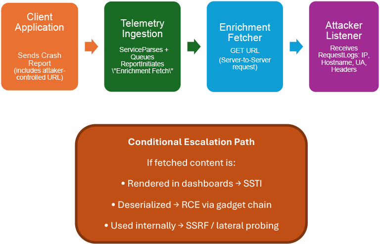 Telemetry Relay is a class of logic-abuse attacks that use legitimate telemetry, crash-reporting, and diagnostic ingestion flows to induce vendor or enterprise processing nodes to fetch attacker-controlled resources, enabling reconnaissance and potential pivoting from those processing nodes. Rather than compromising client endpoints, Telemetry Relay tricks trusted processing nodes, which often run with higher privileges or broader network reach, into making outbound requests to attacker-controlled resources. Such inbound fetches can expose metadata (for example, internal IPs, hostnames, cluster identifiers, or tenant IDs). Escalation beyond metadata disclosure, for example to server-side template injection (SSTI) or unsafe deserialization, is conditional and requires vulnerable processing steps (for instance, unescaped template rendering or automatic deserialization of attacker-controlled payloads).