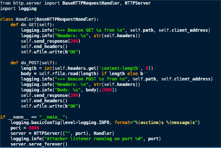 The attacker stands up a simple HTTP listener that logs inbound requests (headers, client IPs, body). In the lab, we used this minimal listener: