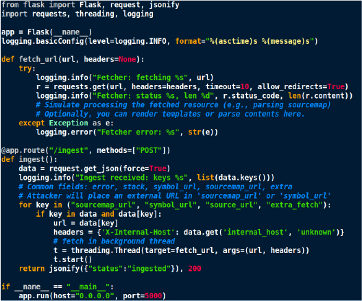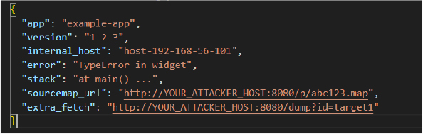 Weaponization: The attacker crafts a telemetry payload (a synthetic crash report, error blob, or enrichment field) that includes one or more attacker-controlled URLs in canonical fields such as sourcemap_url, symbol_url, source_url, or in arbitrary extra fields. The attacker’s endpoint is used to capture inbound requests and headers in a controlled, authorized lab.