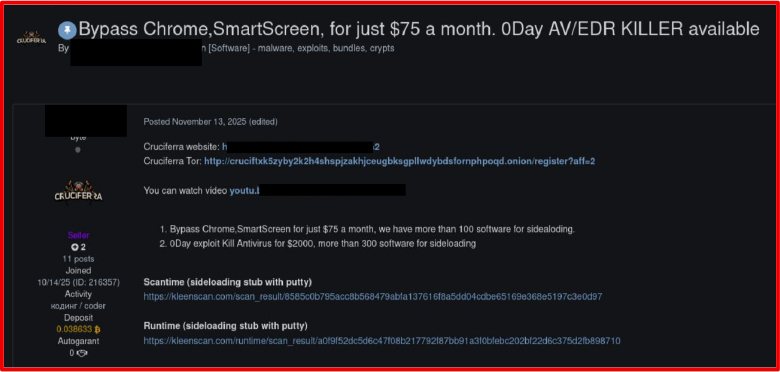 Example of underground forum advertisement for AV/EDR bypass and sideloading tools