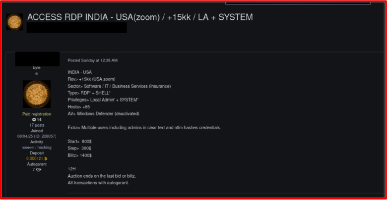 Threat intelligence monitoring of underground forums and Telegram-based Initial Access Broker (IAB) channels during late 2025 revealed a sustained increase in listings derived directly from infostealer logs. Advertisements frequently referenced access to corporate VPNs, Microsoft 365 tenants, and domain-level credentials, often categorized by organization size, geographic region, and security posture.