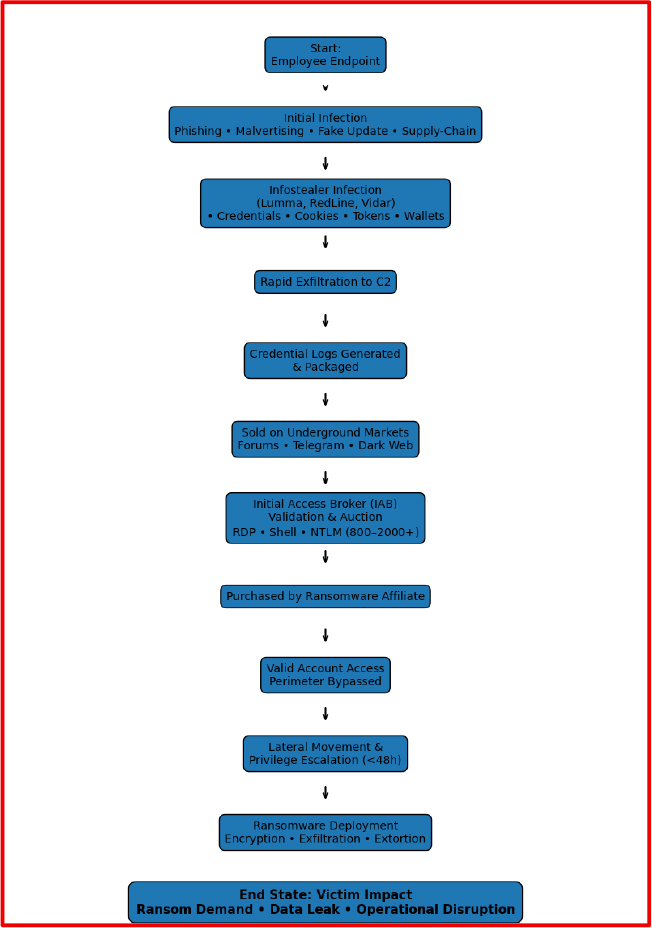 A common attack chain now links infostealer infections to credential exfiltration, sale through Initial Access Brokers (IABs), and subsequent ransomware deployment by affiliates operating within a fragmented ransomware-as-a-service ecosystem.