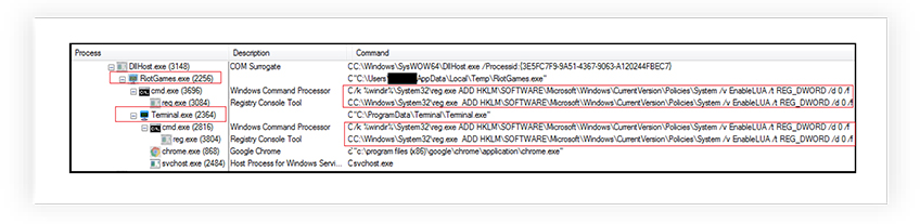 Following is the process tree corresponding to execution of RiotGames.exe. It modifies a registry value called EnableLUA under the HKLM\SOFTWARE\Microsoft\Windows\CurrentVersion\Policies\System key. It sets the value to 0, which effectively disables the User Account Control’s (UAC) User Interface for consent prompts.