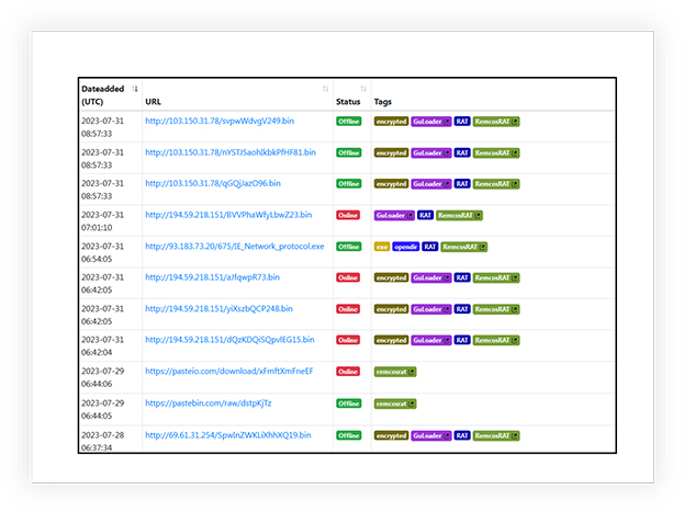 As per the OSINT investigation, such IPs/URLs hosting Remcos RAT and delivering such malicious payloads on infected machines are constantly reported by independent researchers and such discovery increased in the past two months. The Following are several URLs/IPs identified using OSINT investigation, hosting Remcos RAT, GuLoader and other malicious files.