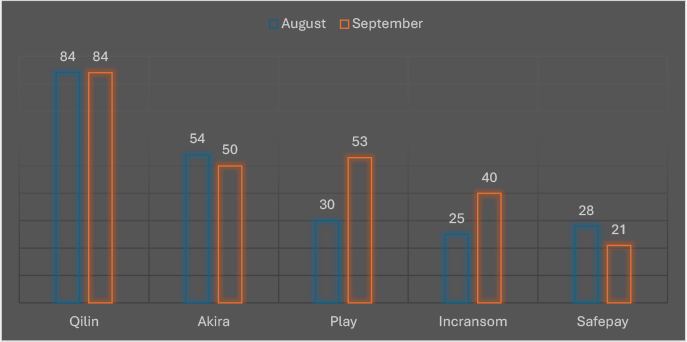 Throughout Sept 2025, there was notable activity from several ransomware groups. Here are the trends regarding the top 5: