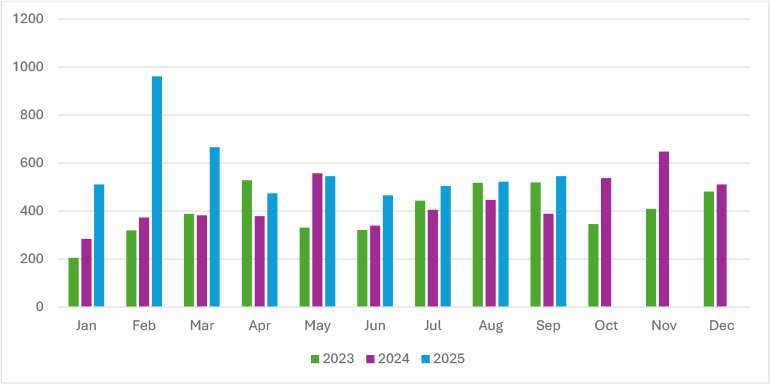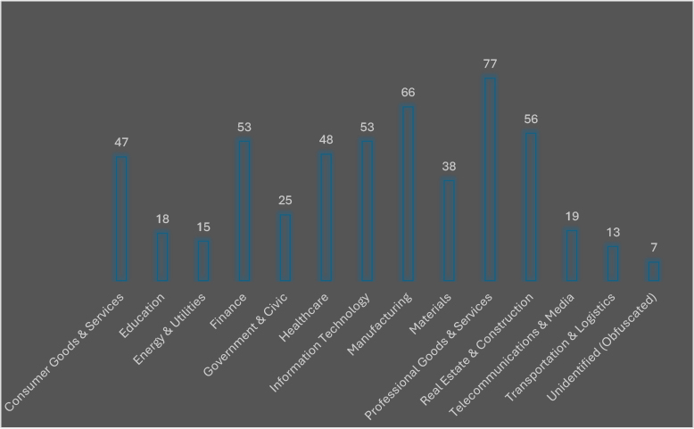 Ransomware victim volumes in 2025 reflect sharp volatility compared to prior years. After peaking at 961 cases in February, activity declined through the spring, bottoming out at 465 in June. The summer months showed relative stability, with July (504), August (522), and September (545), maintaining a steady pace. While this mid-year cooling contrasts with the explosive early-year surge, the overall scale remains significantly higher than in 2023–2024. The downturn likely reflects affiliate reshuffling, reduced output from high-volume operators, such as Incransom and Qilin, and possible tactical pivots toward quieter, more targeted intrusions. At the same time, actors like Devman and Safepay may be regrouping after early spikes or experimenting with campaigns that emphasize persistence over volume. Despite these fluctuations, ransomware remains deeply entrenched, with 2025 figures already outpacing previous years by a wide margin.