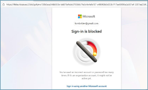 Following credential capture, the victim is shown a false error screen that suggests their login was blocked for security reasons. Tycoon uses this decoy to: