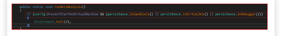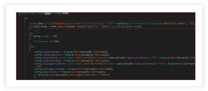 The RAT reads the file located in the current directory, likely a configuration file, and decodes the contents. The file is split into an array using the delimiter ‘|’ and a marker [EOF]. It validates the decoded information: if the array does not contain at least 14 elements, the application terminates. It utilizes a custom encoding method (Rot13) to decode the array elements. It assigns decoded values to corresponding properties in the config class that define various operational settings of the malware.